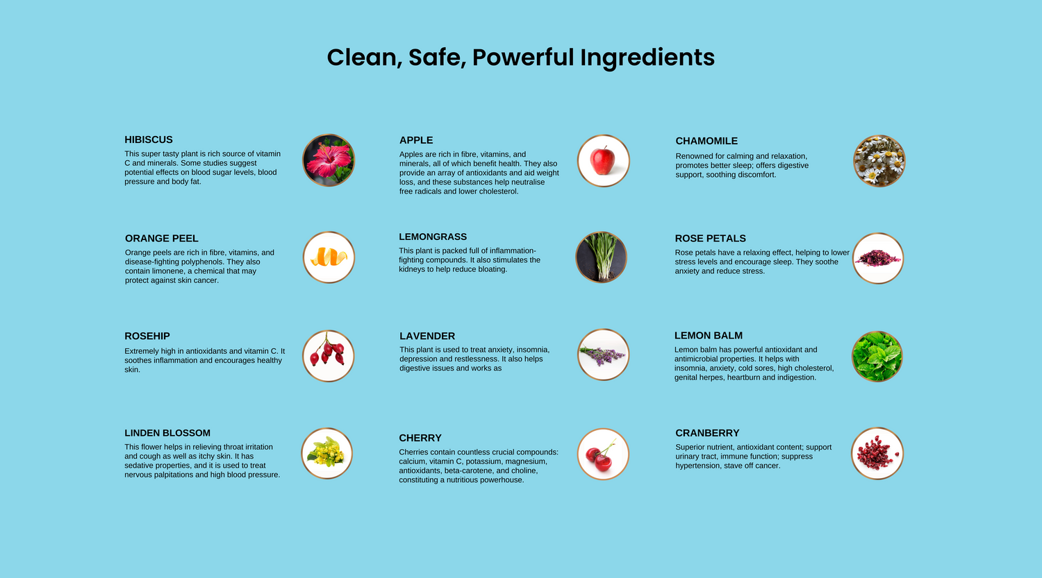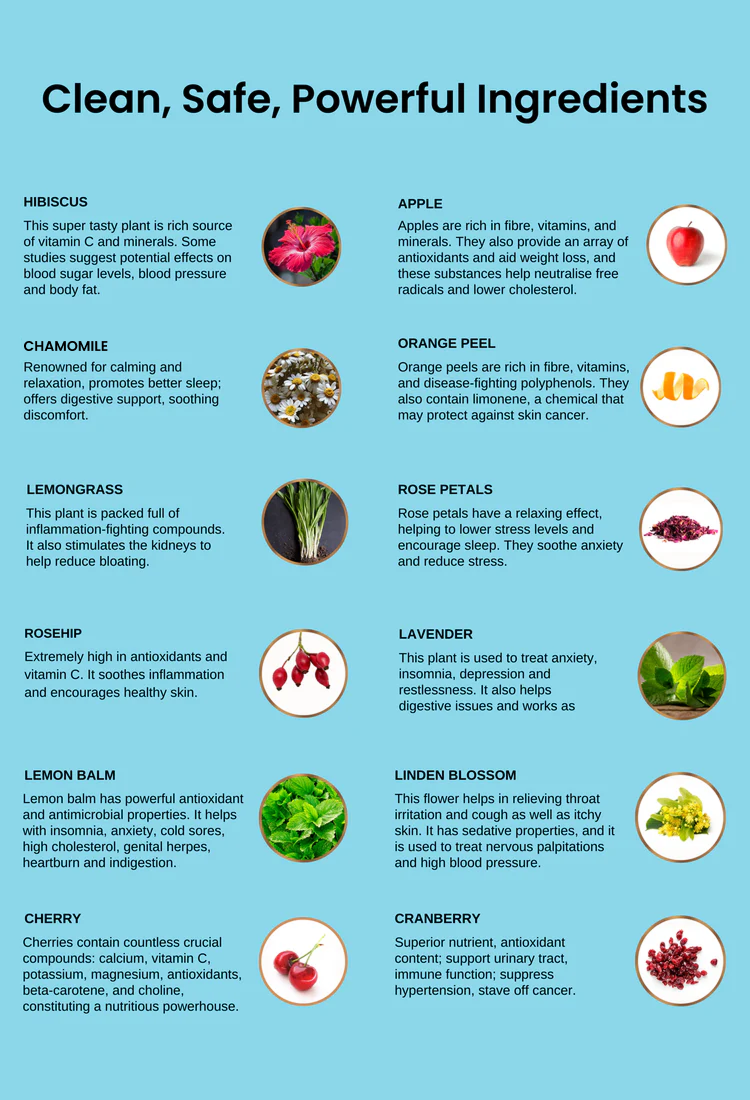 Rich in vitamins, minerals, and antioxidants – the help of apple, hibiscus, and lemon balm reduces blood sugar levels, blood pressure, body fat, and neutralises free radicals and lowers cholesterol.